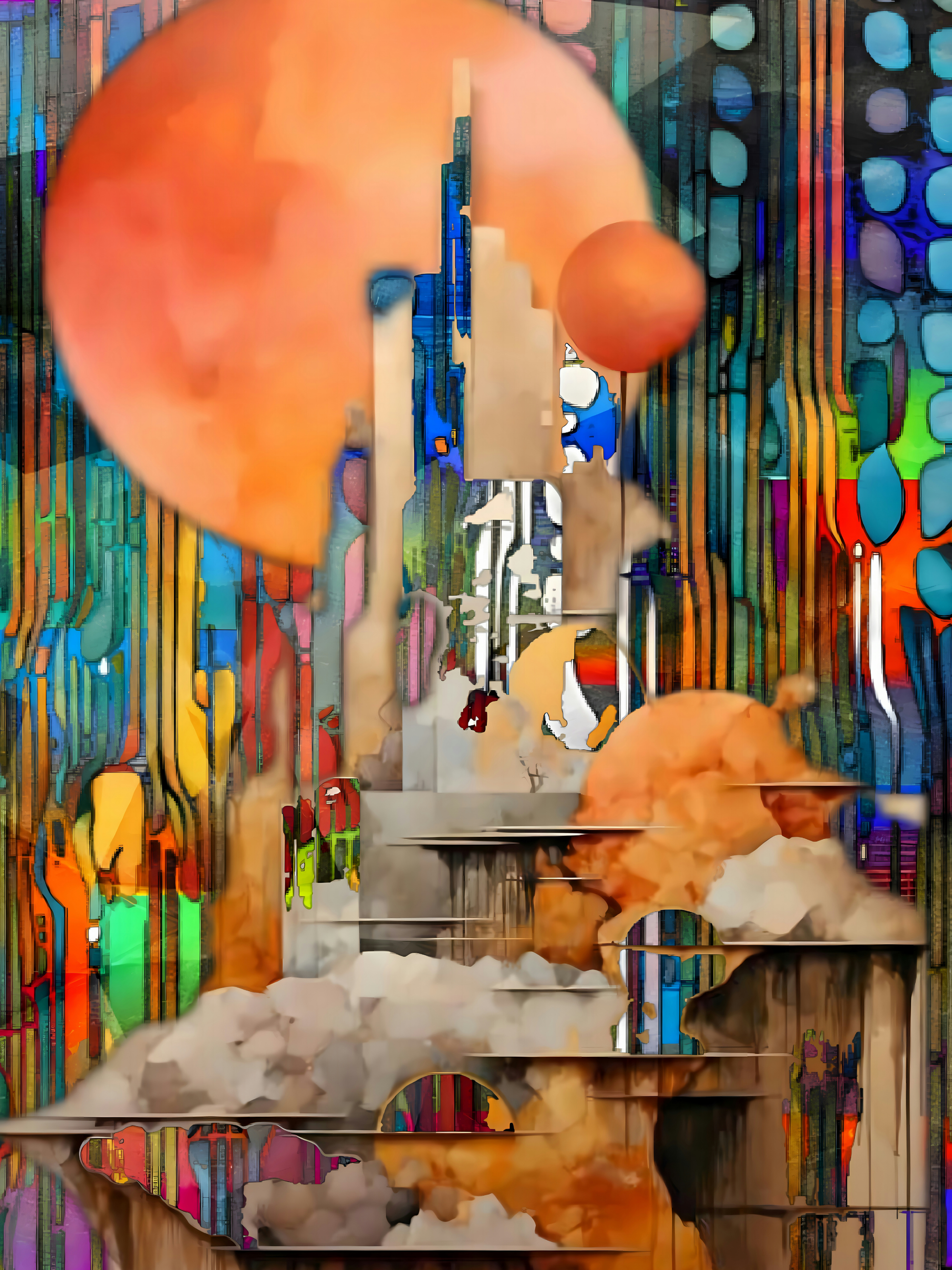 A towering structure ascends from clouds of molten orange, pierced by suns that glow like circuitry brought to life. Streaks of color—neon blues, burning reds, and vibrant greens—flow vertically like the wiring of a city’s soul. The mood is both futuristic and mythic, evoking humanity’s eternal urge to build upward, toward light and possibility.