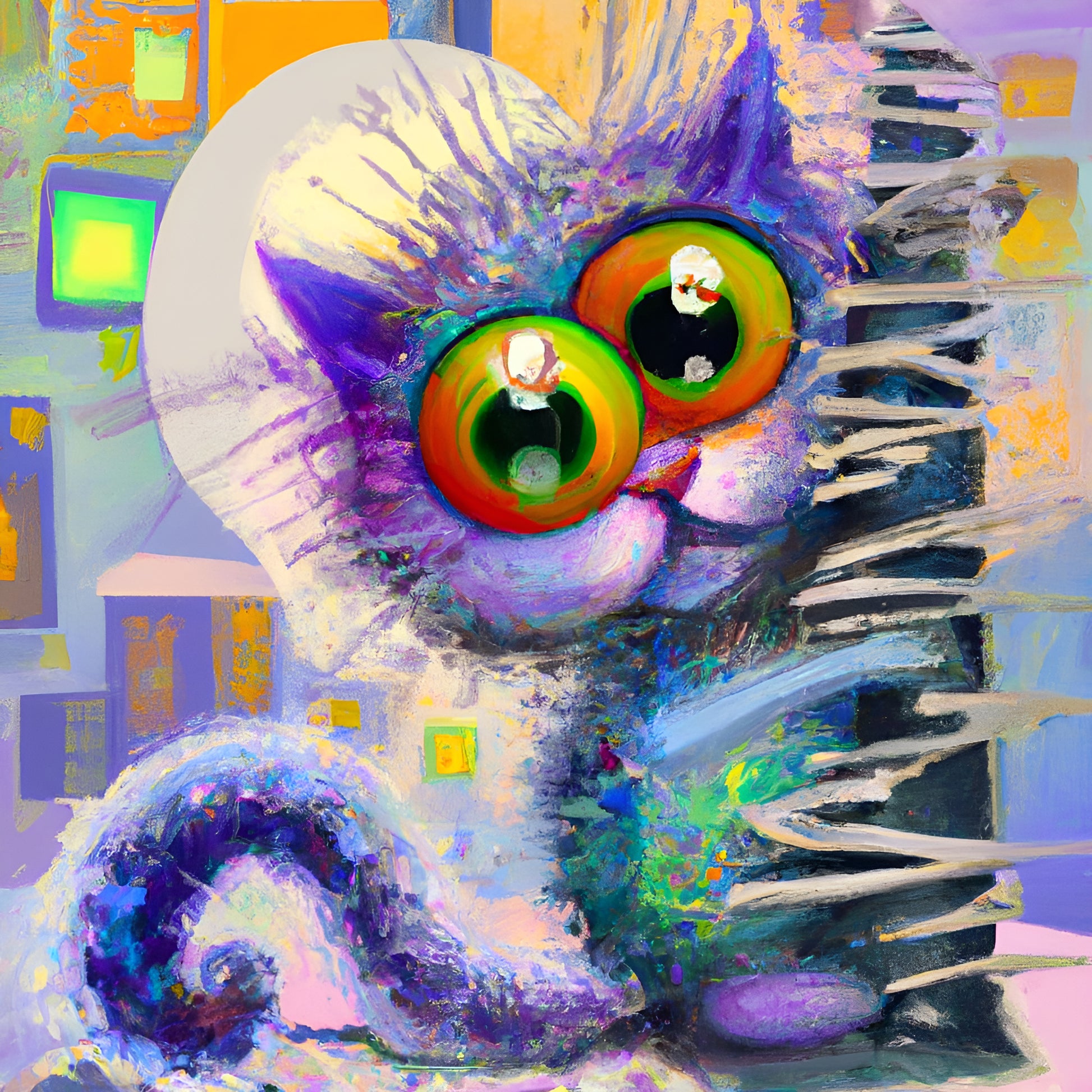 Nicki Pet Art is a vibrant artwork that depicts a charming cat with oversized green eyes and a playful demeanour. Its purple-and-pastel fur contrasts with an abstract background of colourful squares and shapes, while lively brushstrokes and bright hues create a cheerful, whimsical, and imaginative composition.