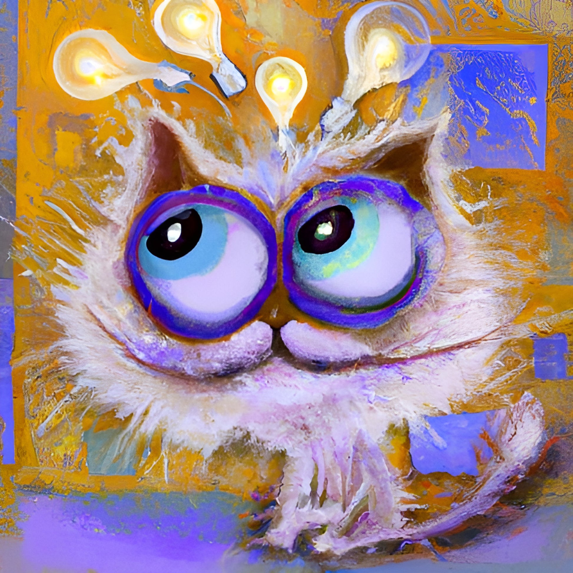 This enchanting artwork portrays a whimsical white cat with oversized, curious eyes, set against a vivid blend of warm oranges and cool blues. Floating lightbulbs above its head suggest bursts of creativity, while the bold colours and playful design radiate joy, making the cat a charming symbol of imagination and wonder.