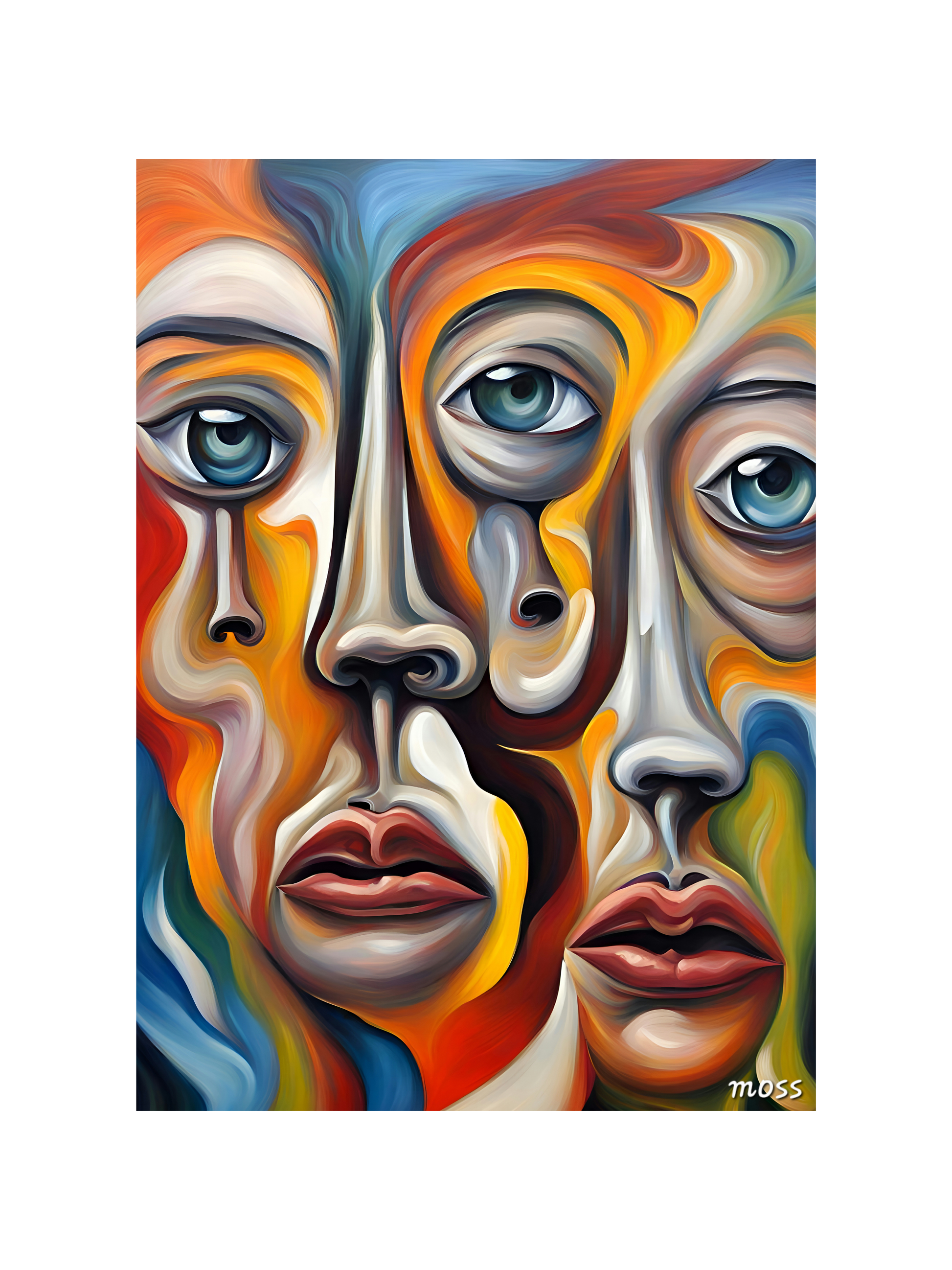 Three faces merge into one flowing composition of emotion and color—tones of amber, blue, and crimson swirling like thoughts too deep to name. Their wide, reflective eyes seem to share an unspoken understanding, a moment of connection suspended in quiet intensity. The painting vibrates with empathy, capturing the fragile power of human stillness.
